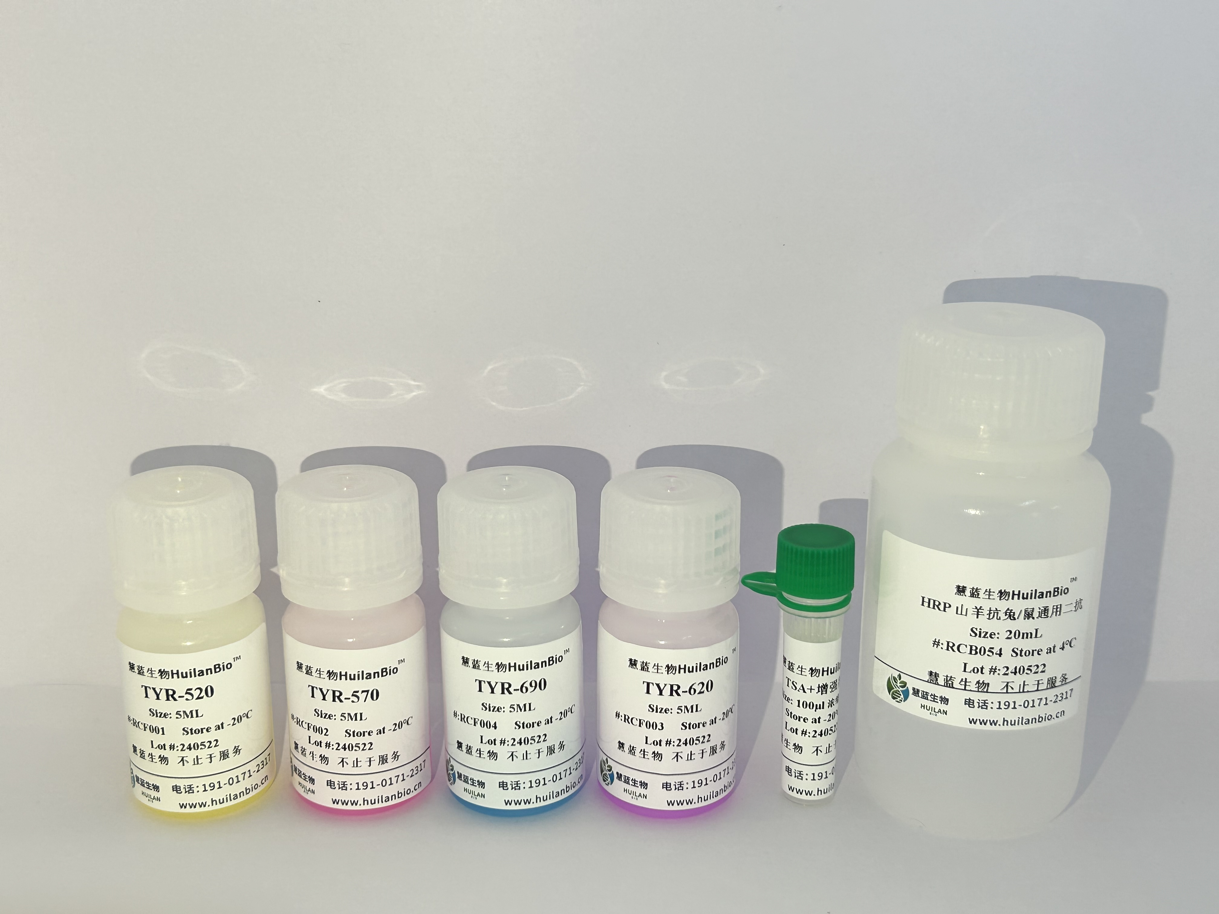 TSA 详细原理是利用酪胺 Tyramide 的过氧化物酶反应(酪胺盐在 HRP 催化 H202 下形成共价键结合位 点) ,产生大量的酶促产物,该产物能与周围的蛋白残基(包括色氨酸、组氨酸和酪氨酸残基)结合,这样在 抗原-抗体结合部位就有大量的荧光素沉积,结果使其检测信号得到 10- 100 倍增强。简单来说,用这种方法 做多重免疫荧光是利用二抗上带有的 HRP(而不是直接偶联荧光素),来催化后续添加入体系的非活性荧 光素。荧光素在 HRP 和过氧化氢的作用下被活化,跟临近蛋白的酪氨酸残基共价偶联,使得蛋白样品与荧 光素稳定结合。然后微波或煮沸或者水浴等热修复处理,前一轮非共价结合的抗体被洗掉,共价结合的荧 光素稳定共价结合在样本切片蛋白上。再换个一抗来第二轮孵育,周而复始。等到所有抗体孵育结束,荧 光素都结合好后,最后去检测结果。 由于每次体系中都只有单一抗体孵育,因此无需担心抗体交叉反应, 以及一抗二抗种属匹配问题,大大减少了实验设计时不同种属抗体选择匹配的限制。也就是说,如果用 TSA 技术,同一张片子上所有的靶标都可以选用特异性高的兔单克隆抗体。搭配同一支抗兔的 HRP 二抗就可以 进行实验,而且信号放大的倍数大大增强。本公司开发的试剂盒具体酪胺荧光染料为以下其中一种或者多 种:TYR-480 ,TYR-520 ,TYR-570 ,TYR-620 ,TYR-690 ,TYR-780 。此试剂盒中 的荧光染料可单独或配合使用。可以实现单标、双标、三标以及更多重荧光放大/多重同源抗体荧光标记等 功能,极大丰富了此试剂盒的内涵。