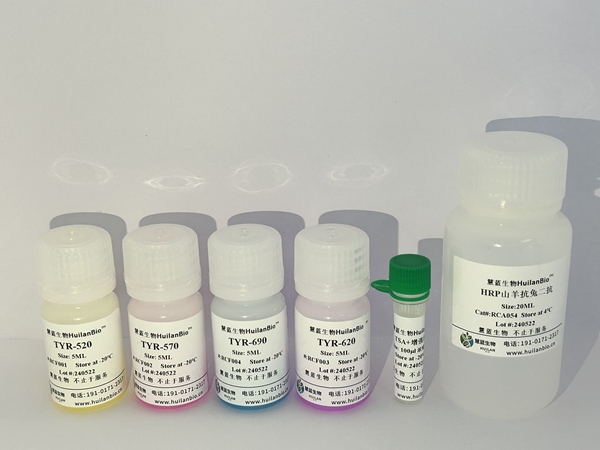TSA 详细原理是利用酪胺 Tyramide 的过氧化物酶反应(酪胺盐在 HRP 催化 H202 下形成共价键结合位 点) ,产生大量的酶促产物,该产物能与周围的蛋白残基(包括色氨酸、组氨酸和酪氨酸残基)结合,这样在 抗原-抗体结合部位就有大量的荧光素沉积,结果使其检测信号得到 10- 100 倍增强。简单来说,用这种方法 做多重免疫荧光是利用二抗上带有的 HRP(而不是直接偶联荧光素),来催化后续添加入体系的非活性荧 光素。荧光素在 HRP 和过氧化氢的作用下被活化,跟临近蛋白的酪氨酸残基共价偶联,使得蛋白样品与荧 光素稳定结合。然后微波或煮沸或者水浴等热修复处理,前一轮非共价结合的抗体被洗掉,共价结合的荧 光素稳定共价结合在样本切片蛋白上。再换个一抗来第二轮孵育,周而复始。等到所有抗体孵育结束,荧 光素都结合好后,最后去检测结果。 由于每次体系中都只有单一抗体孵育,因此无需担心抗体交叉反应, 以及一抗二抗种属匹配问题,大大减少了实验设计时不同种属抗体选择匹配的限制。也就是说,如果用 TSA 技术,同一张片子上所有的靶标都可以选用特异性高的兔单克隆抗体。搭配同一支抗兔的 HRP 二抗就可以 进行实验,而且信号放大的倍数大大增强。本公司开发的试剂盒具体酪胺荧光染料为以下其中一种或者多 种:TYR-480 ,TYR-520 ,TYR-570 ,TYR-620 ,TYR-690 ,TYR-780 。此试剂盒中 的荧光染料可单独或配合使用。可以实现单标、双标、三标以及更多重荧光放大/多重同源抗体荧光标记等 功能,极大丰富了此试剂盒的内涵。