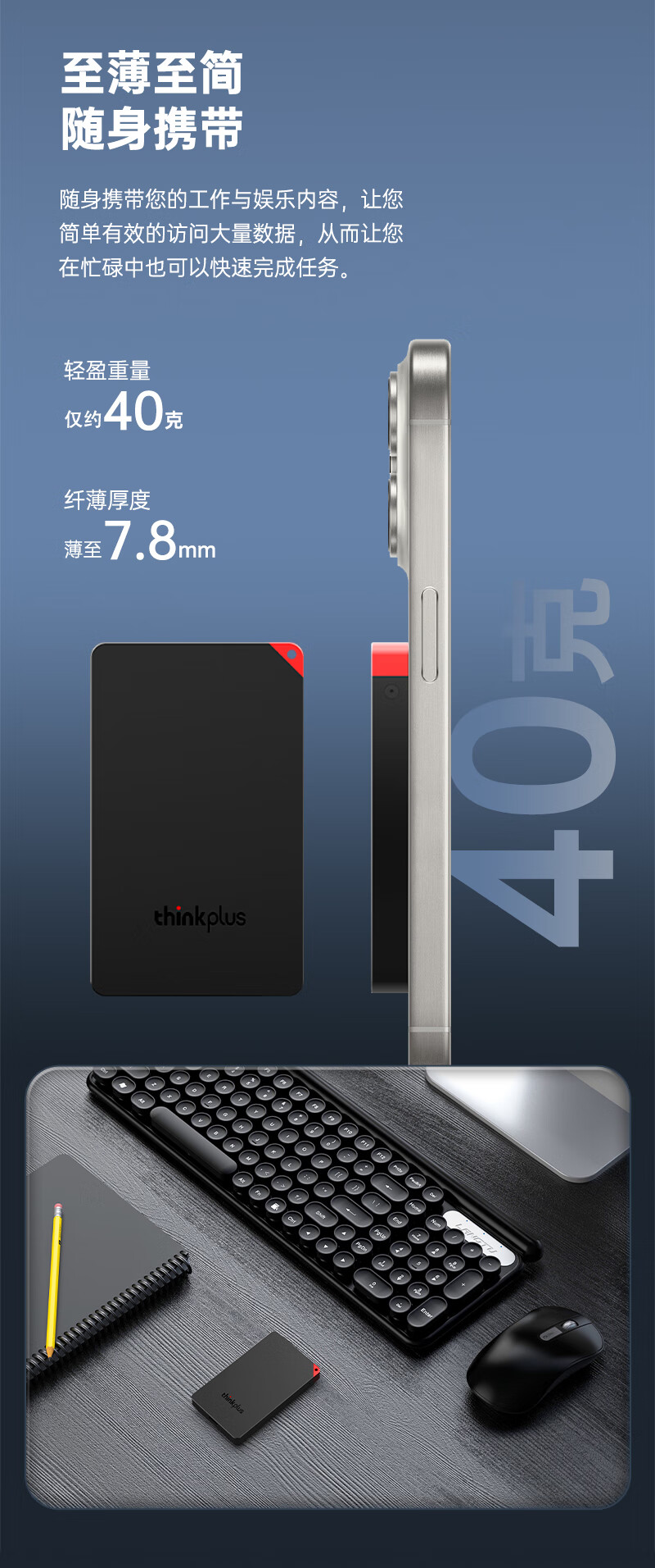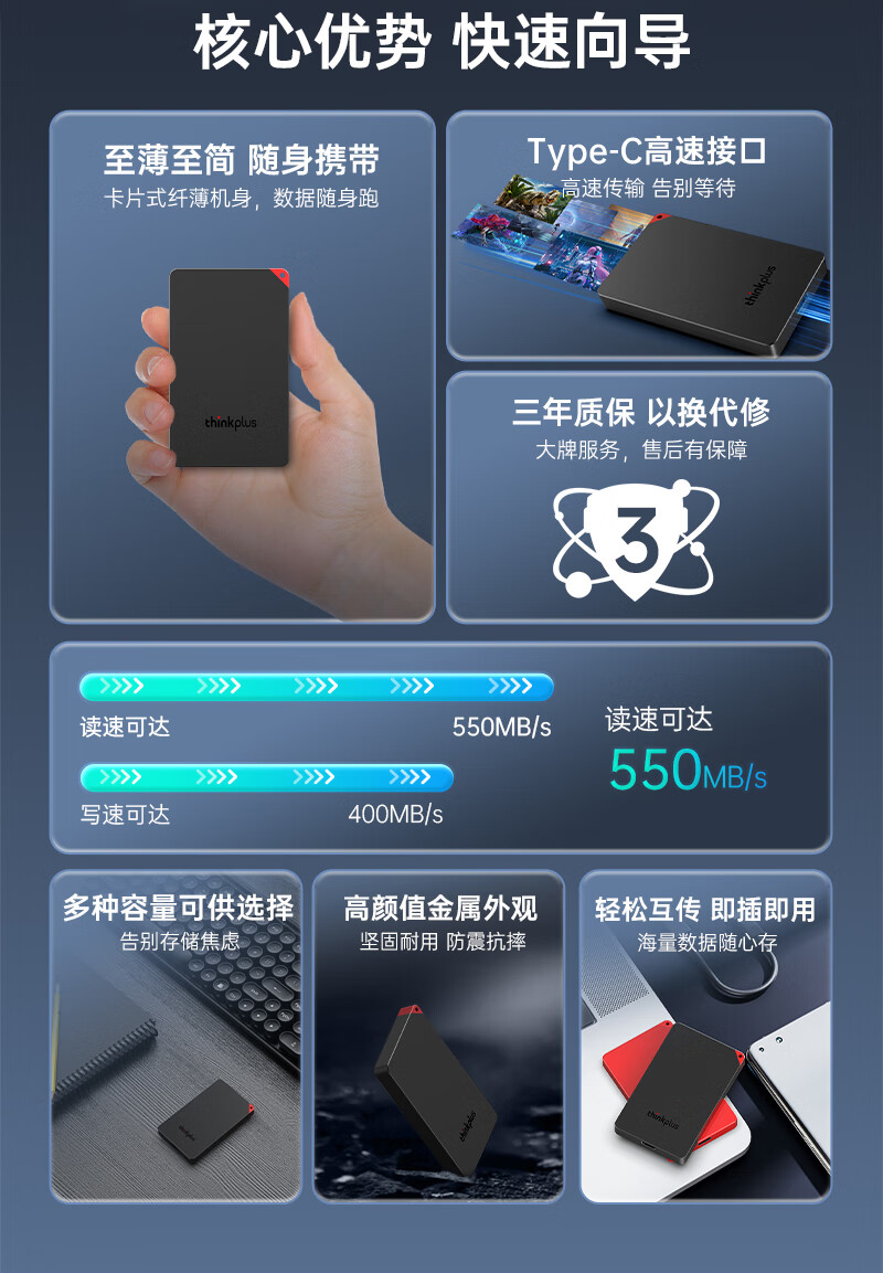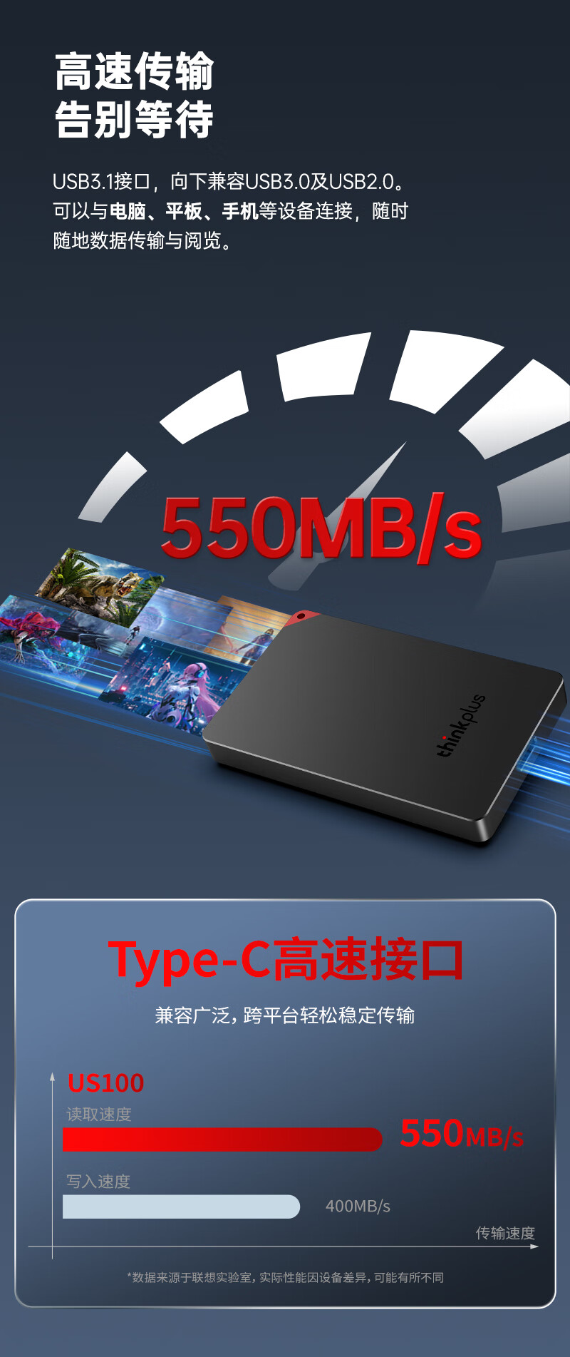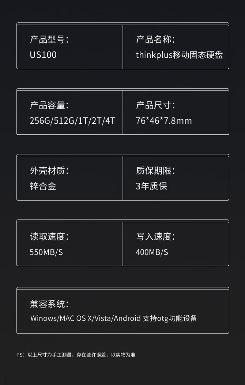 "联想 thinkplus 2TB移动固态硬盘 USB3.2高速PSSD移动硬盘小巧便携读取400MB/S US100黑色"商品可能已被商家删除,您可查看其他相似商品!