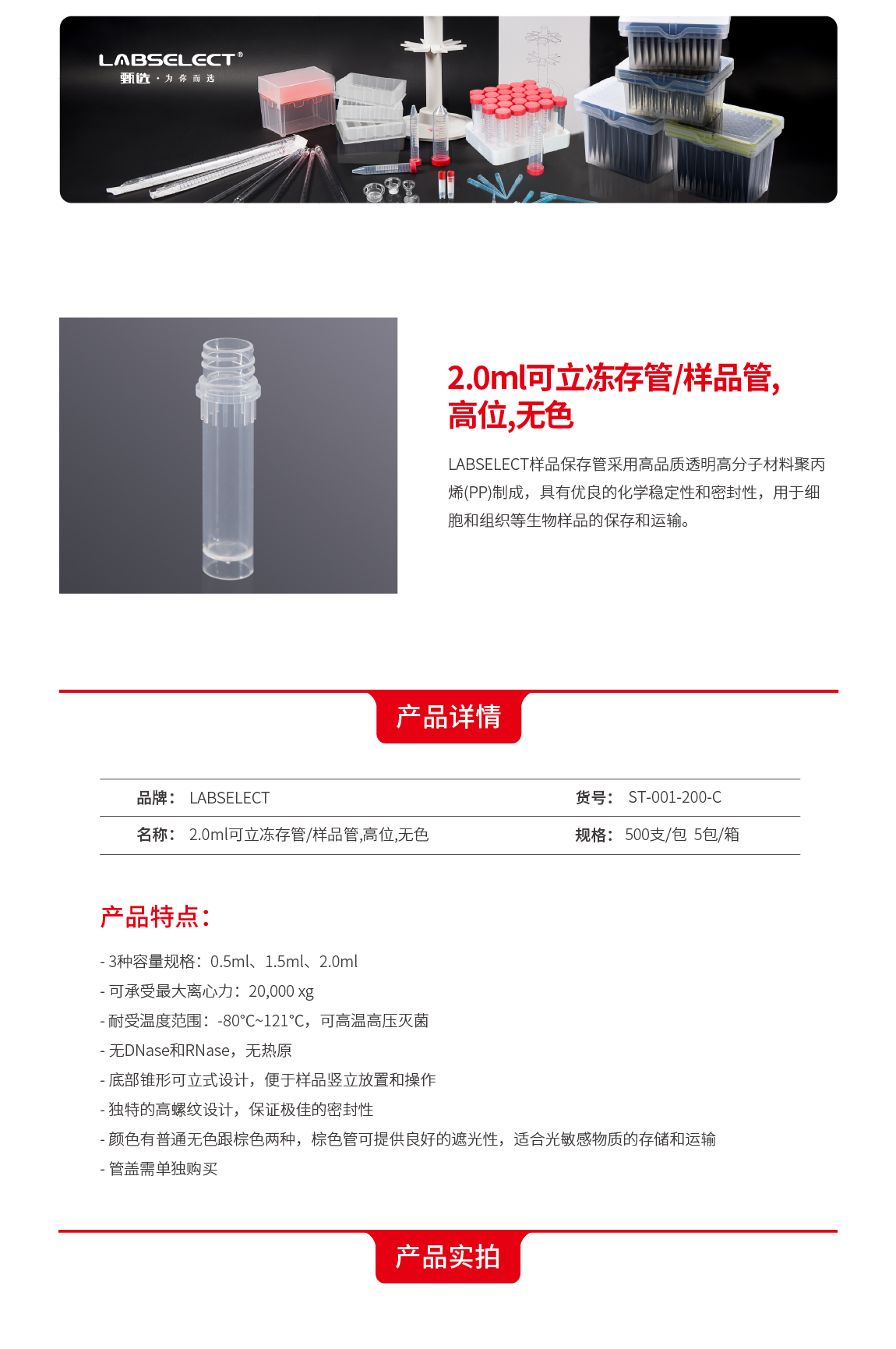 "ST-001-200-C 2.0ml可立冻存管/样品管,高位,无色 箱"商品可能已被商家删除,您可查看其他相似商品!