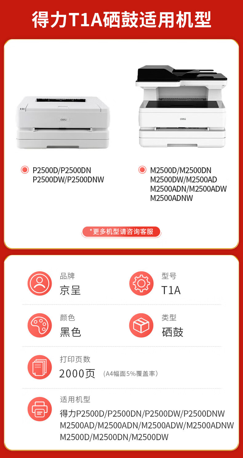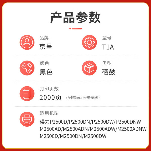 "京呈PLUS版适用得力T1A硒鼓P2500D P2500DN P2500DW P2500DNW M2500A 【带芯片】T1A黑色硒鼓 约2000页"商品可能已被商家删除,您可查看其他相似商品!