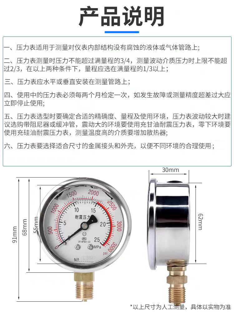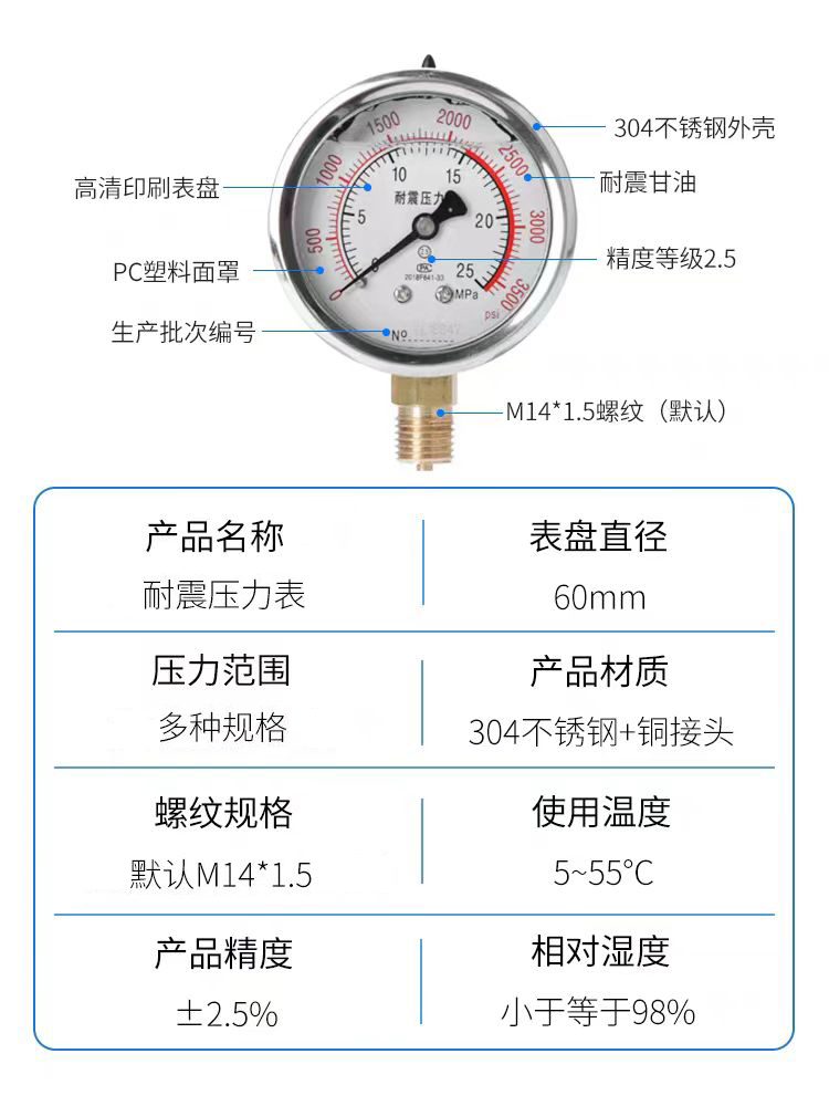 详细参数:抗震压力:0-1.6Mpa(M14*1.5)