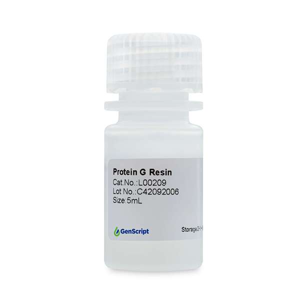 GenScript Protein G Resin is an affinity chromatography medium designed for easy, one-step purification of classes, subclasses and fragments of immunoglobulins from biological fluids and cell culture media. The recombinant protein G ligand is coupled to 4% highly cross-linked agarose. The static binding capacity of Protein G Resin is over 20 mg sheep IgG/ml settled resin. The dynamic binding capacity will vary depending on several factors such as target antibody, flow rate etc.