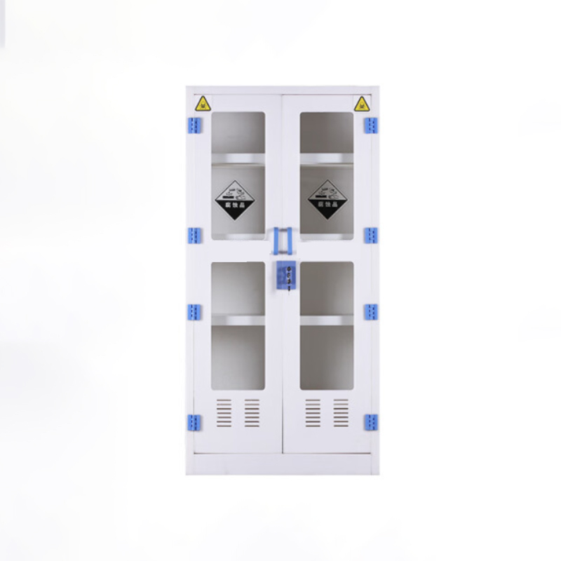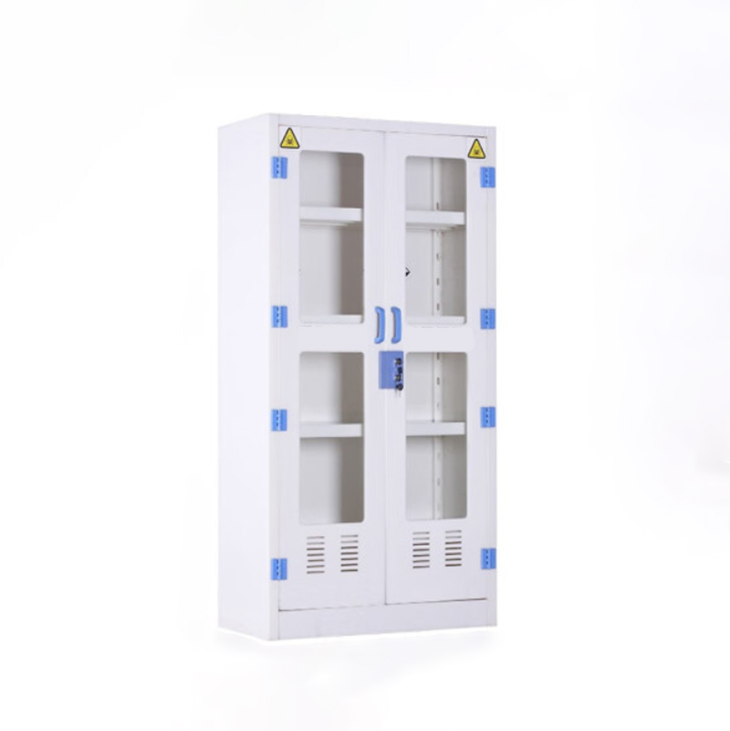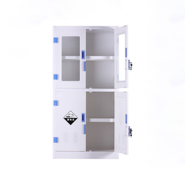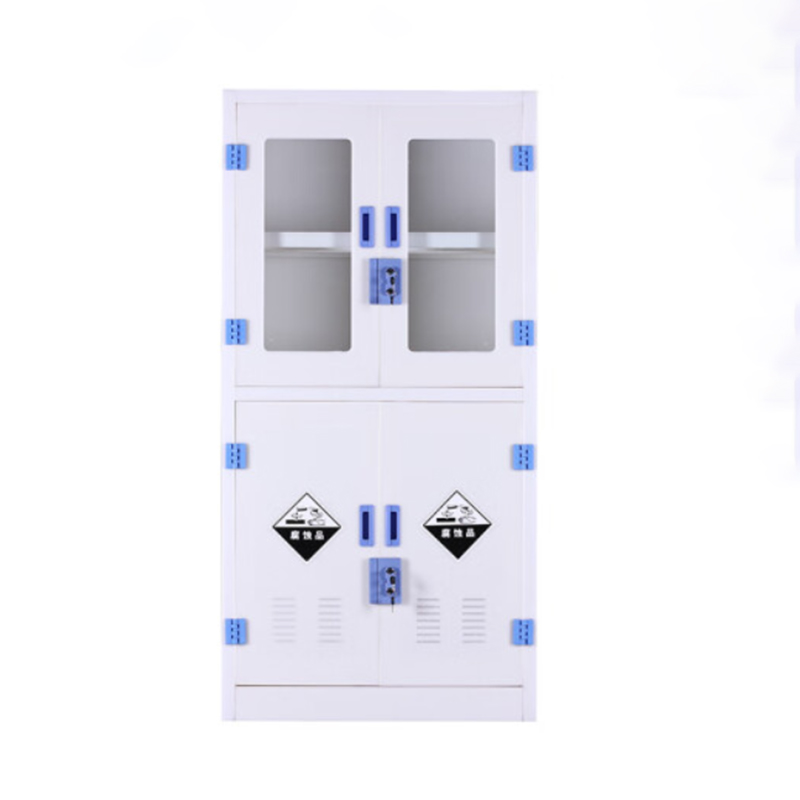 主体采用8mm厚优质纯料PP(聚丙烯)板制作,具有耐强酸碱性能。顶部边沿加宽稳定、承重性能更好。对接处均采用同色焊条专业手工经无缝焊接而成,抗强酸、化学药品,耐冲击,不腐蚀,不生锈。连接部分所有的内部连接装置都需隐藏布置和抗腐蚀,没有外露的螺钉,外部连接装置都抗化学腐蚀的不锈钢部件与非金属材料。上玻璃门嵌入5mm厚玻璃,下PP门板。柜体颜色整体为瓷白色,拉手及合页为蓝色,主体为拆 装结构,尺寸均可定制。合页、碰珠、螺丝均采用PP材质耐强酸、强碱等良好性能,柜门开启角度180度。拉手采用同柜体材料PP板制作成型,拉手为U型麻面。柜内上部2块活动层板,下部1块活动层板并设有挡边防止物品滑落。特点美观,便于拆装,整体耐高温低于100°,耐腐蚀,不生锈,使用寿命长,是化学实验室配置中至优选择。