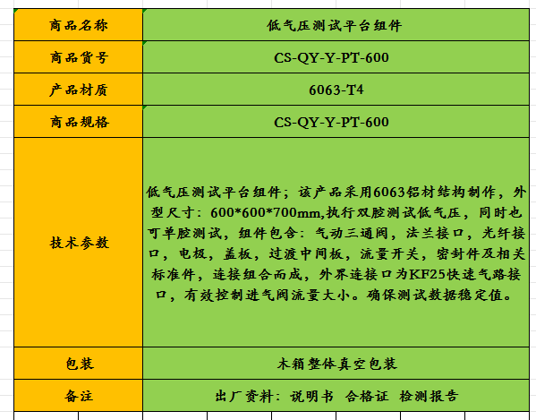 商品名称:低气压测试平台组件 规格型号:CS-QY-Y-PT-600 生产厂家:四川德迪普科技有限公司