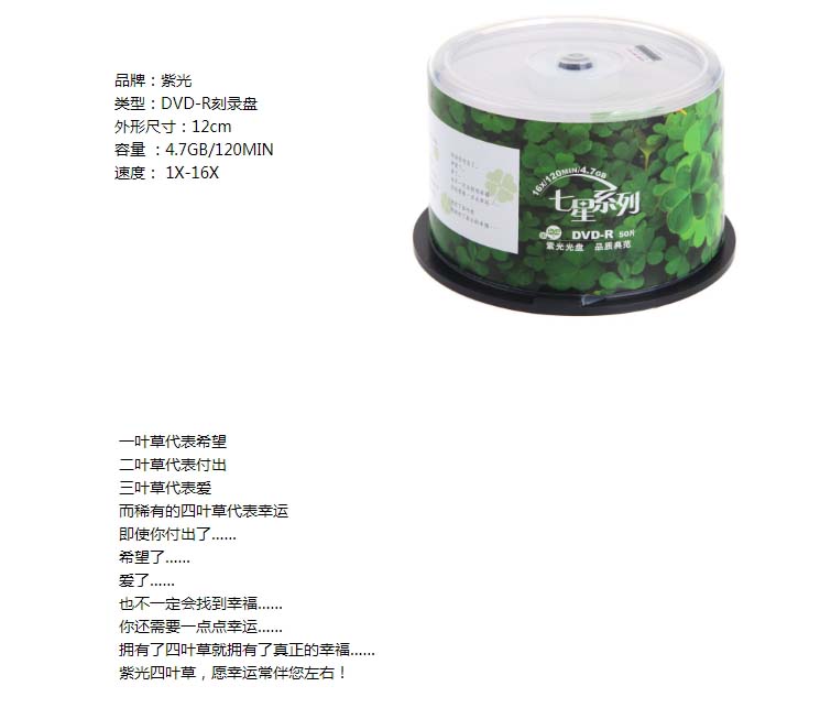 "紫光 DVD-R 刻录盘 七星四叶草 16速4.7G 50片/桶"商品可能已被商家删除,您可查看其他相似商品!