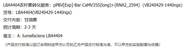 "LBA4404农杆菌转化服务: pPBV[Exp]-Bar-CaMV35S(long)>{RNA2_2594}(VB240 429-1440ngs)"商品可能已被商家删除,您可查看其他相似商品!