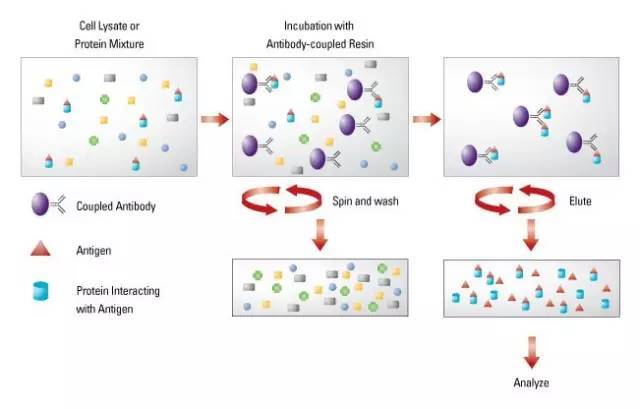 免疫共沉淀(Co-Immunoprecipitation,CoIP)以抗体和抗原之间的特异免疫反应为基础,是研究蛋白质互作的经典方法。基本原理是在细胞裂解液中加入抗原特异的抗体进行孵育,若裂解中有和抗原互作的蛋白,则会形成“抗体-抗原-抗原互作蛋白”的免疫复合物,该免疫复合物经纯化、洗脱、收集,即可用于SDS-PAGE,western blot及质谱分析,进而鉴定出与抗原有互作的蛋白质。