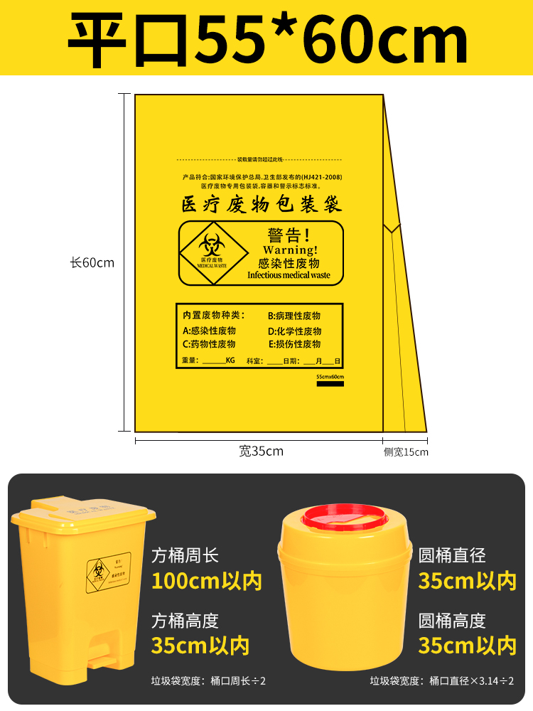 医疗废物垃圾袋 医用废品专用加厚塑料包装袋 规格:黄色/平口式 55*60cm 100只/件