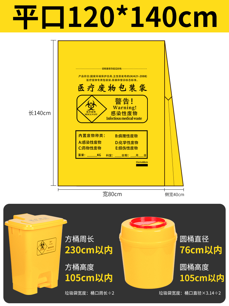 医疗废物垃圾袋 医用废品专用加厚塑料包装袋 规格:黄色/平口式 120*140cm 50只/件
