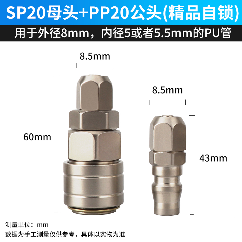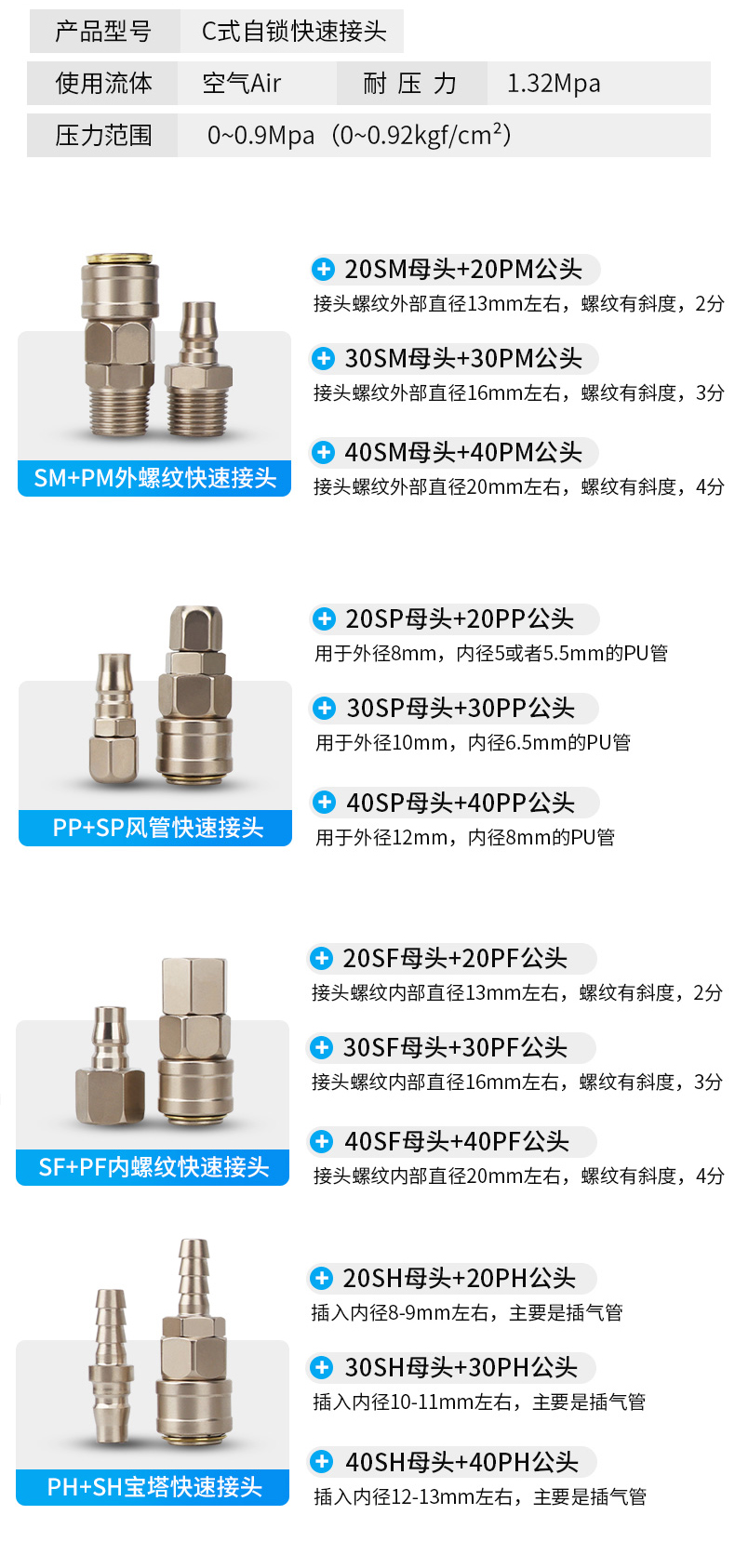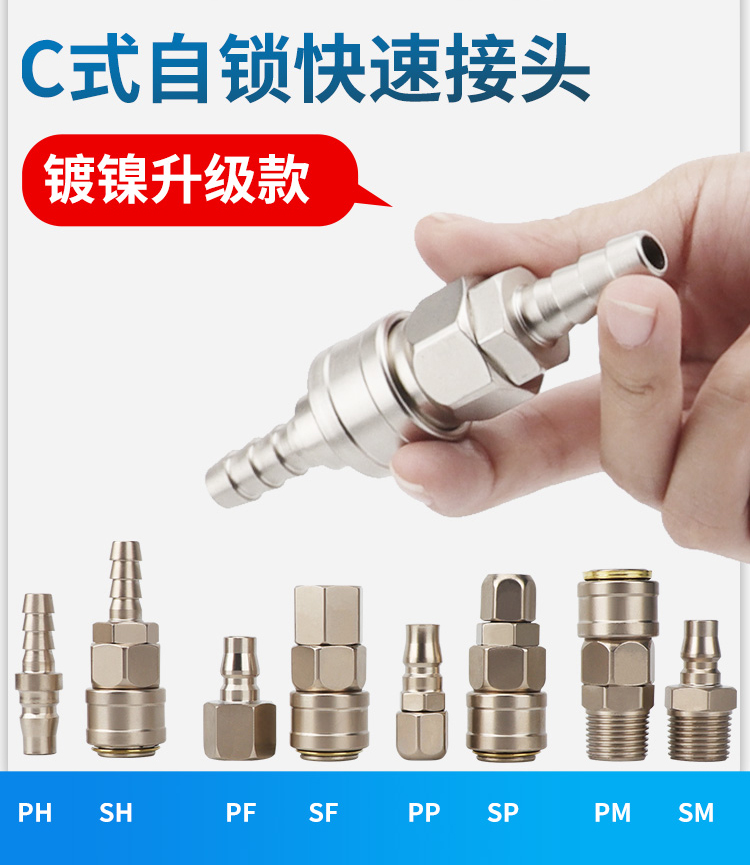 | 空压机配件 C式自锁气管快速接头 SP20母头+PP20公头 全铜内芯 材质:碳钢 |