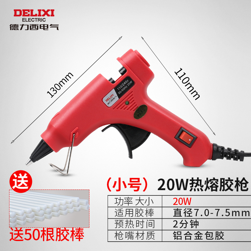 | 德力西热熔胶枪 家用手工制作玻璃电胶枪 热熔胶棒胶水条枪 小号20W热熔胶枪+50根胶棒 |