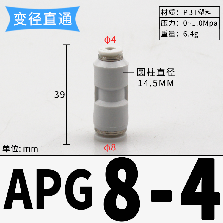 | PU气管变径接头 大小变径直通 直通接头 APG8-4 白色/二通8mm转4mm 10个/件 |