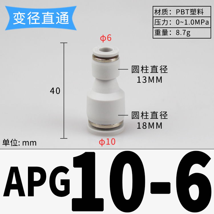 | PU气管变径接头 大小变径直通 直通接头 APG10-6 白色/二通10mm转6mm 10个/件 |
