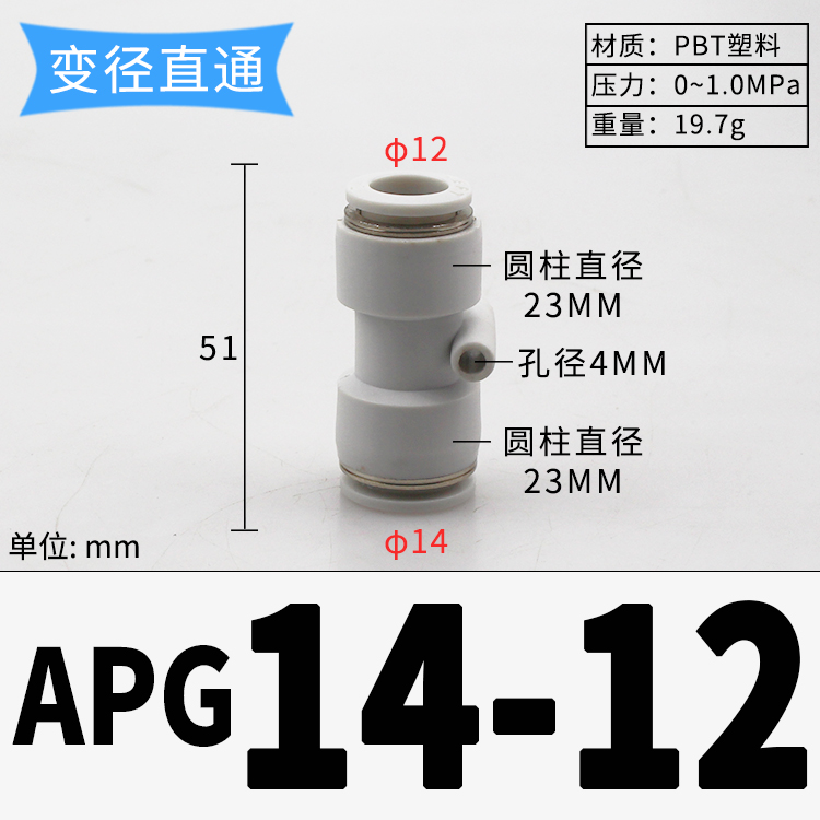 | PU气管变径接头 大小变径直通 直通接头 APG14-12 白色/二通14mm转12mm 10个/件 |