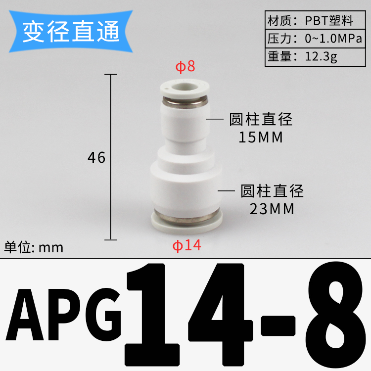 | PU气管变径接头 大小变径直通 直通接头 APG14-8 白色/二通14mm转8mm 10个/件 |