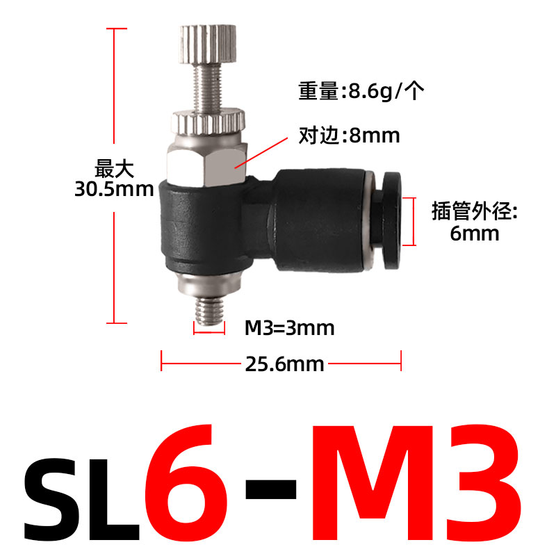 | 快速接头 调速开关 调节阀 节流阀 气动可调气缸 调速调节管道阀 黑色微型节流阀 SL-6-M3 5个/件 |