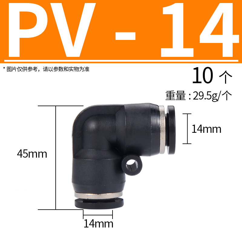 | PV快速接头 PV气动气管接头 直角90度快接头 L型弯头塑料快插接头 黑色 PV-14 接外径14mm气管 10个/件 |